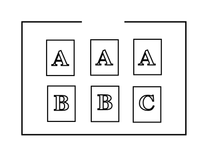 下の図のように箱の中にAの文字が書かれたカードが3枚,Bの文字が書かれたカードが2枚,Cの文字が書かれたカードが1枚入っている。次の(1)~(3)に答えなさい。ただし,箱からどのカードが取り出されることも同様に確からしいものとする。