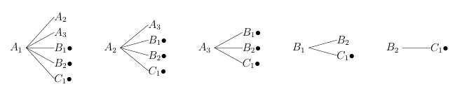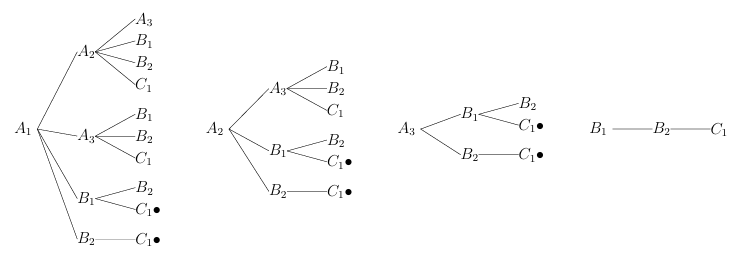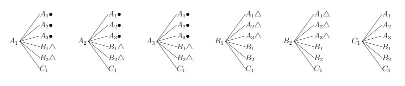 今回emathで樹形図を書きました。emathはとても素晴らしいマクロです。TikZでこのような樹形図が書けるのをご存じの方がいたら教えてください。書いたのですが枝が重なるんです。emathは自動調整してくれるんですけどね。